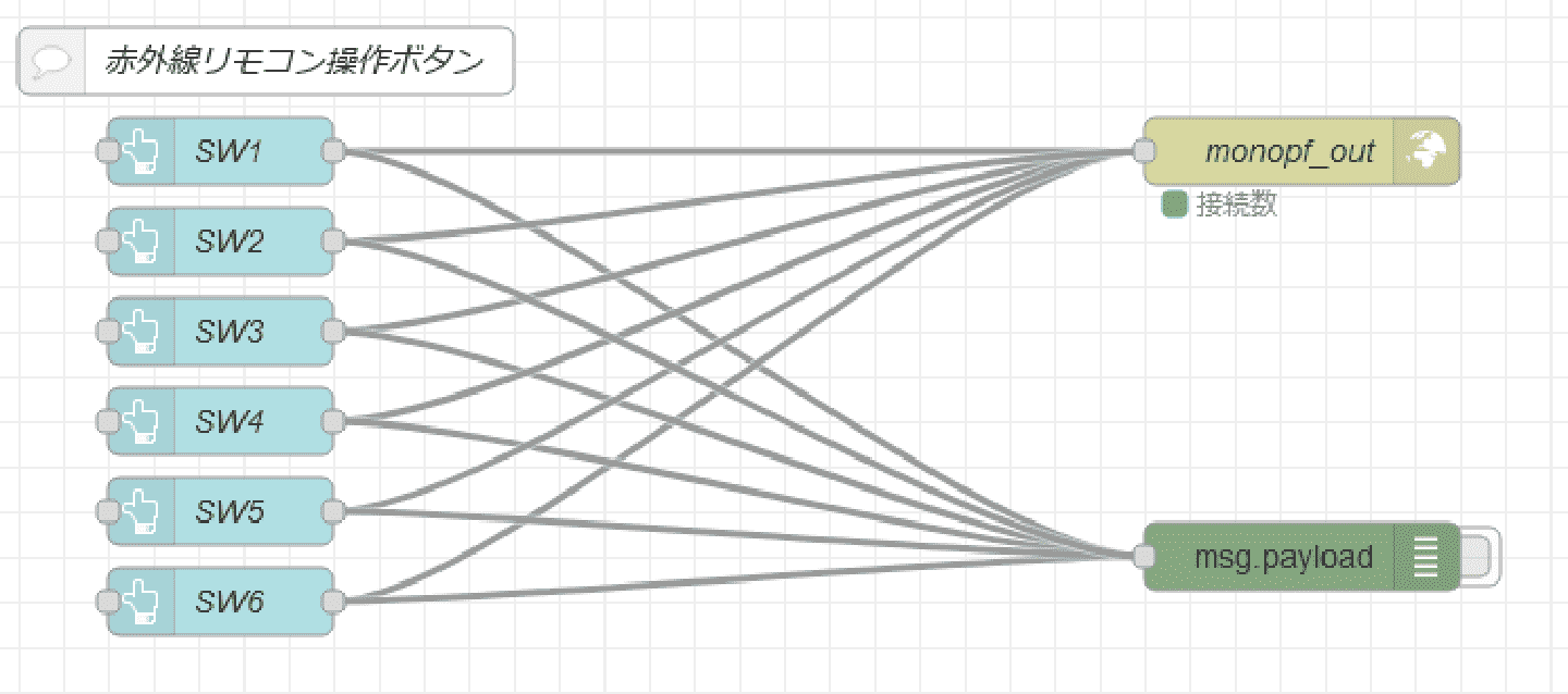赤外線リモコンの操作ボタンは、buttonノード内でjson形式の文字列を直接生成してwebsoket outノードに渡しています。