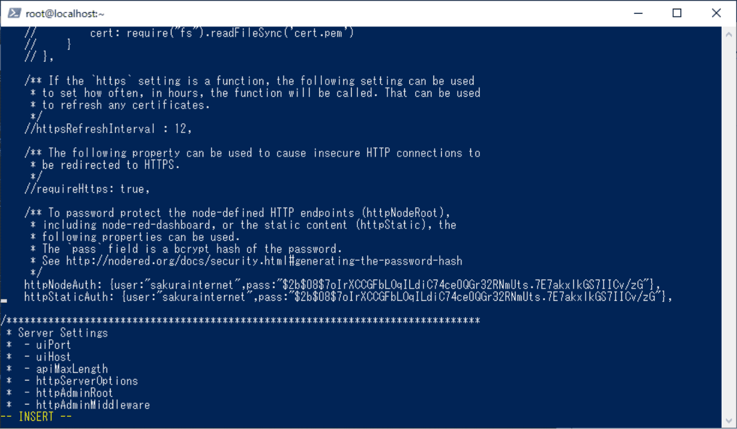 [root@localhost ~]# vi /root/.sacloud-api/notes/root/settings.js←setting.jsonファイルを開く。