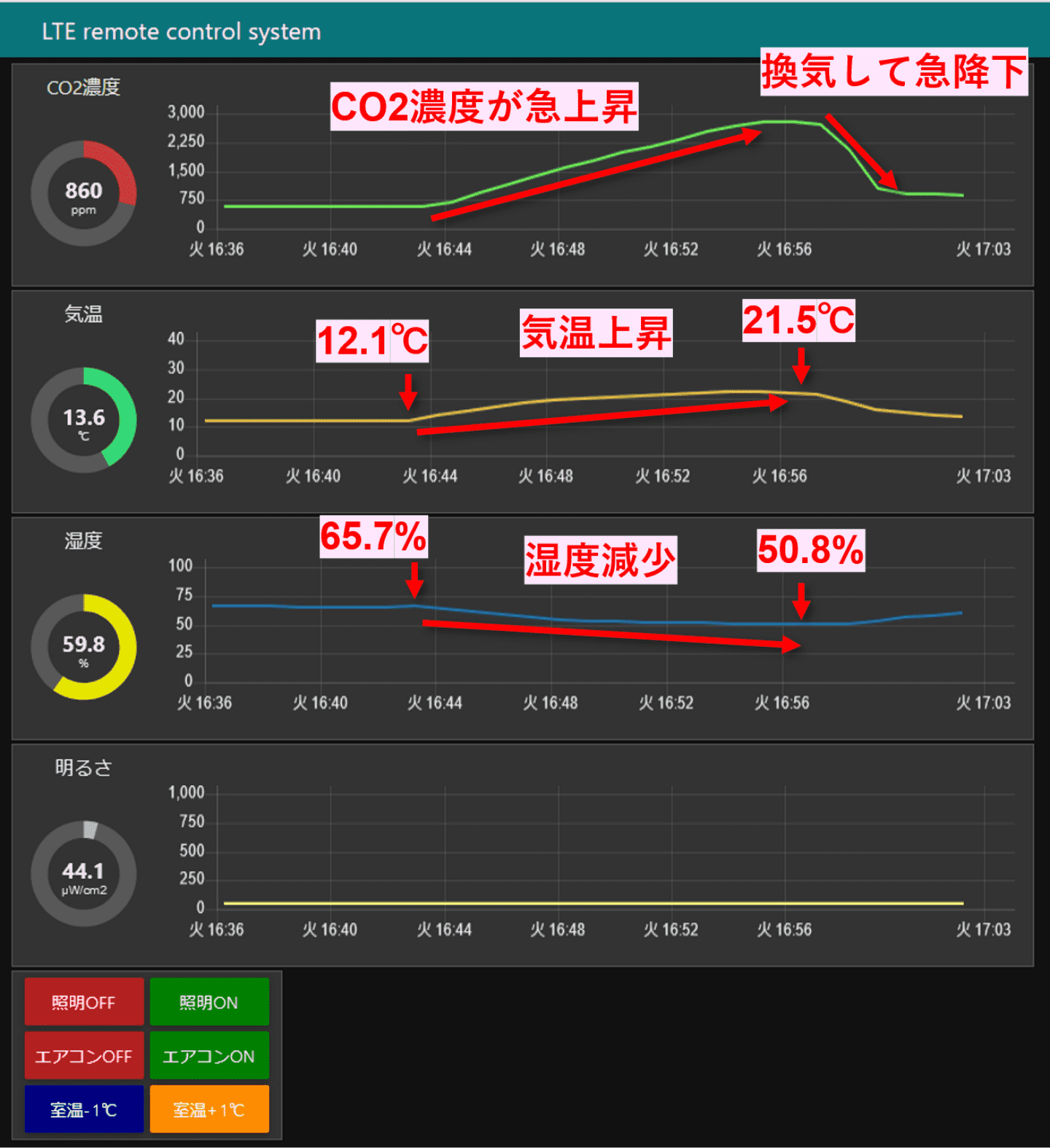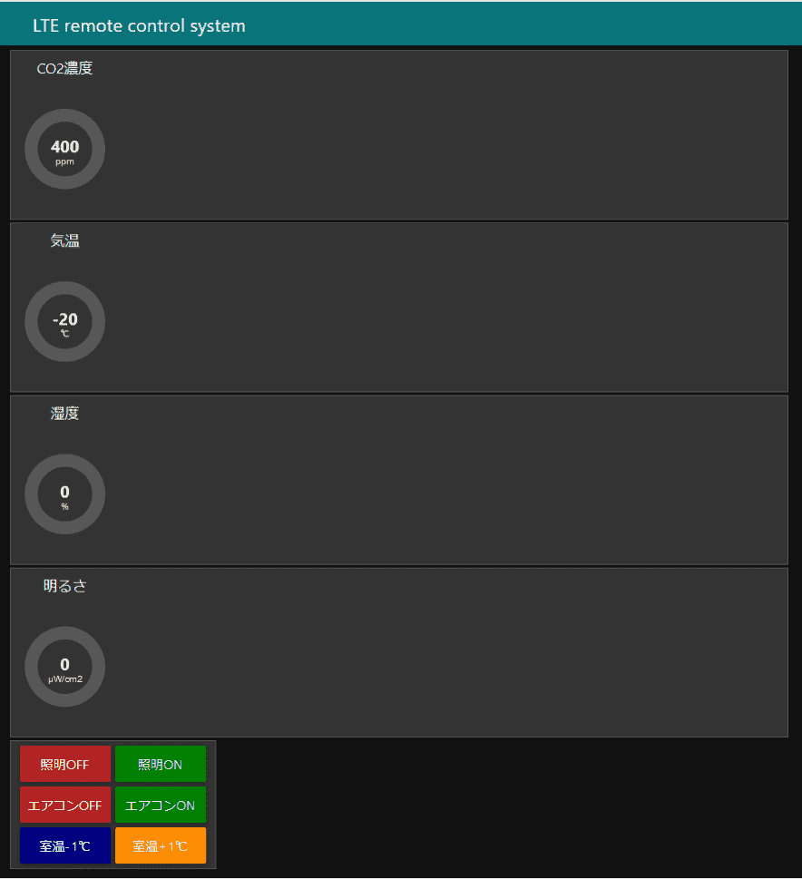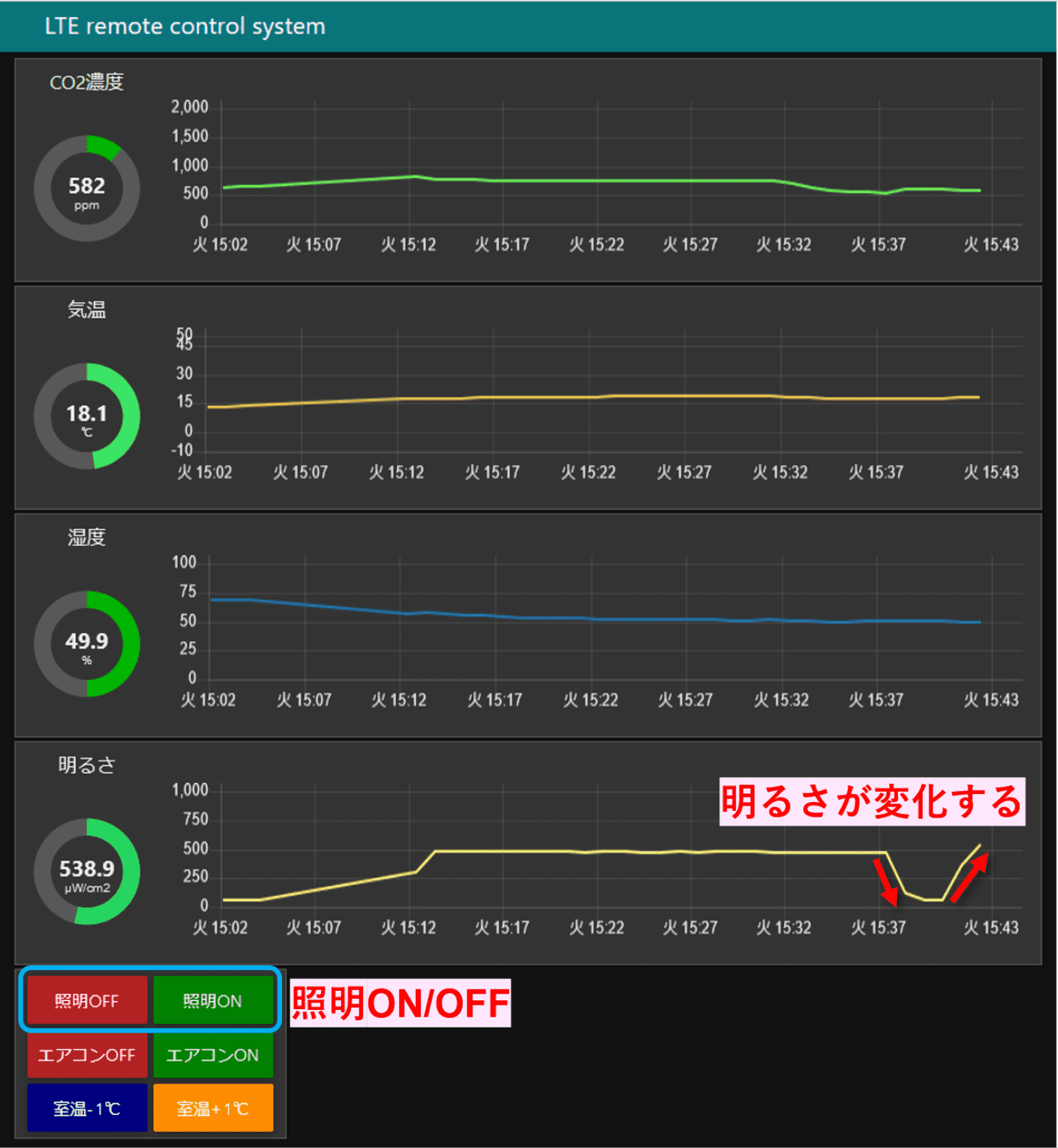 ダッシュボード上の照明ON・照明OFFのボタンを押すことで明るさのパラメータが上下することを確認できます。