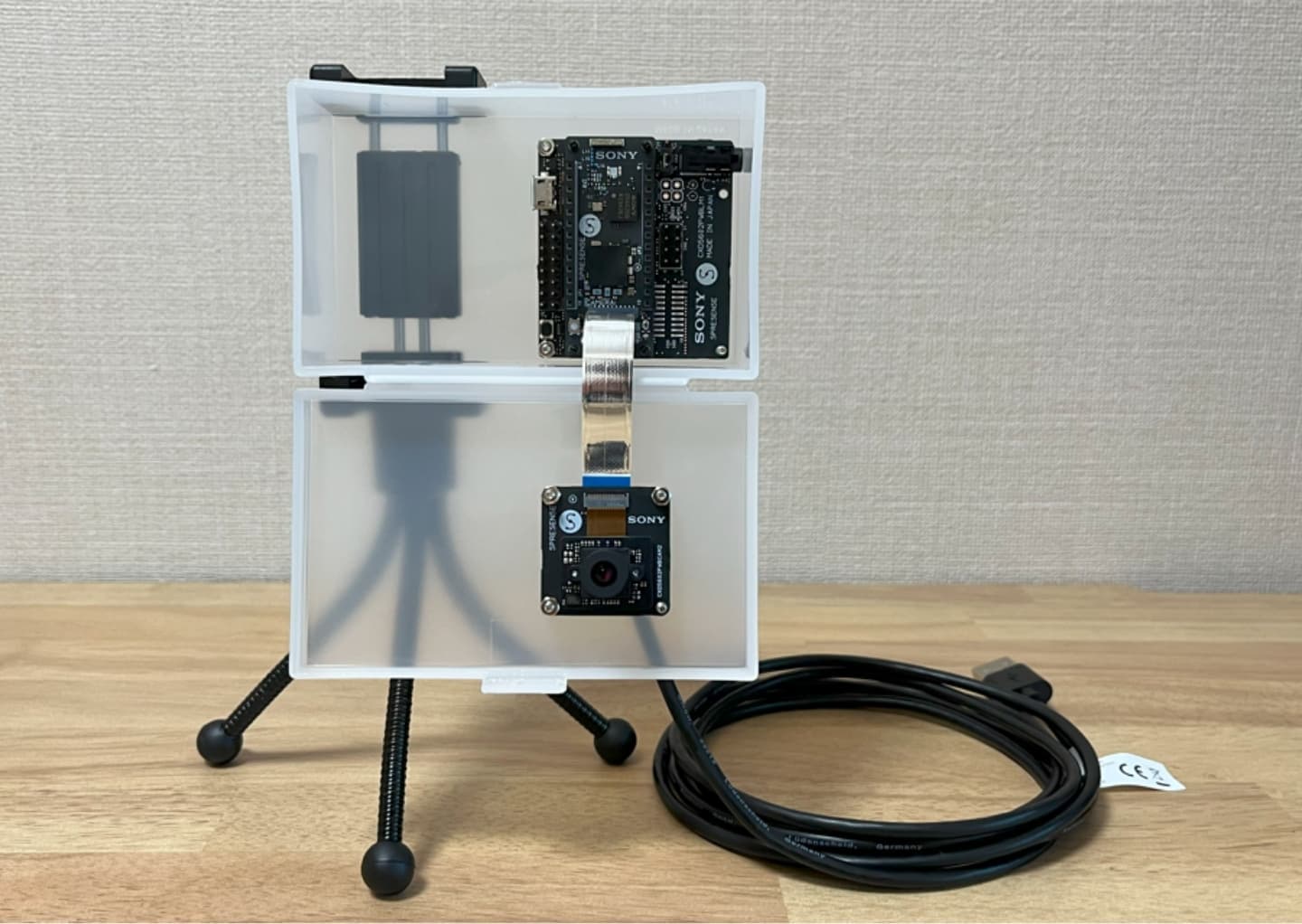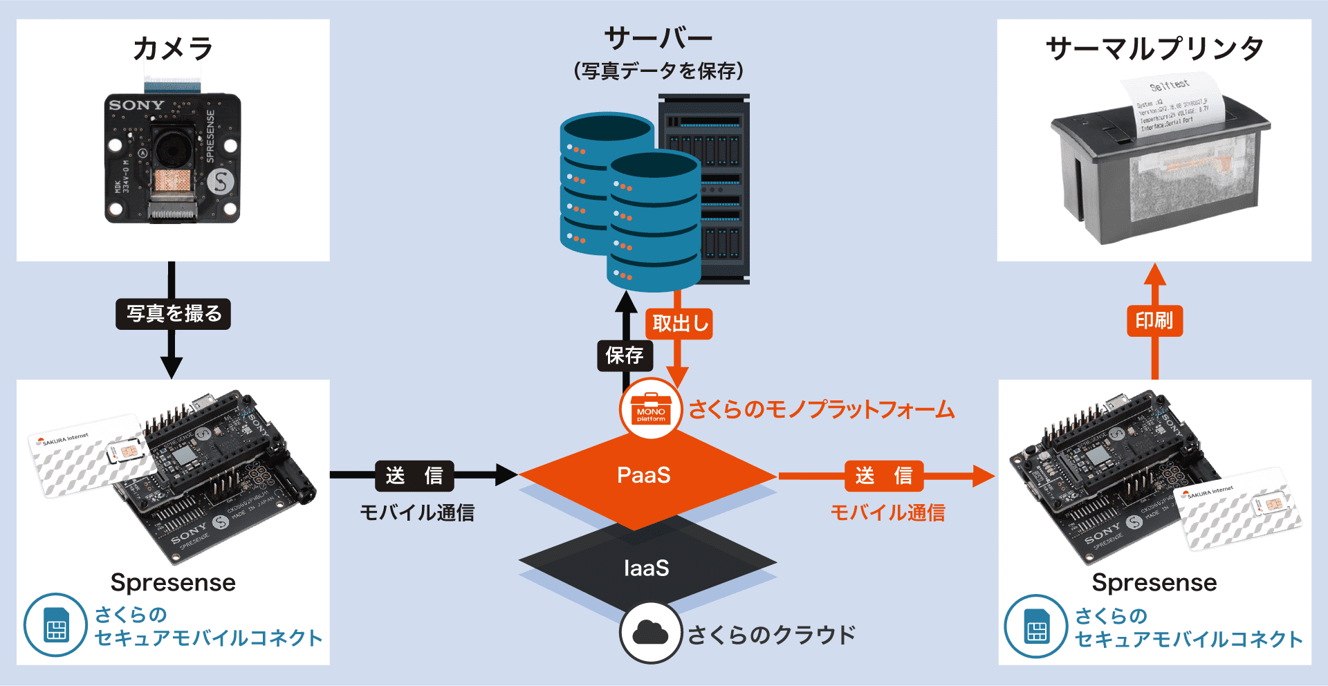 今回の作例は、①カメラ側と ②プリンター側の2点で構成されており、「①カメラ側で定期的に撮影された画像を②プリンター側で定期的に印刷する」といったシステムになります。どちらの機器にもSpresense+LTE拡張ボード+セキュモバSIMが搭載されており、画像の送受信は、セキュモバおよびモノプラを利用して行います。また、ソフトウェアは、Arduino IDEを使用して開発しています。