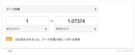となり、変換時にはややこしい計算方法があるのですが、Googleで「GB GiB 変換」と検索すると変換ツールが表示されるのでこれを使いましょう。