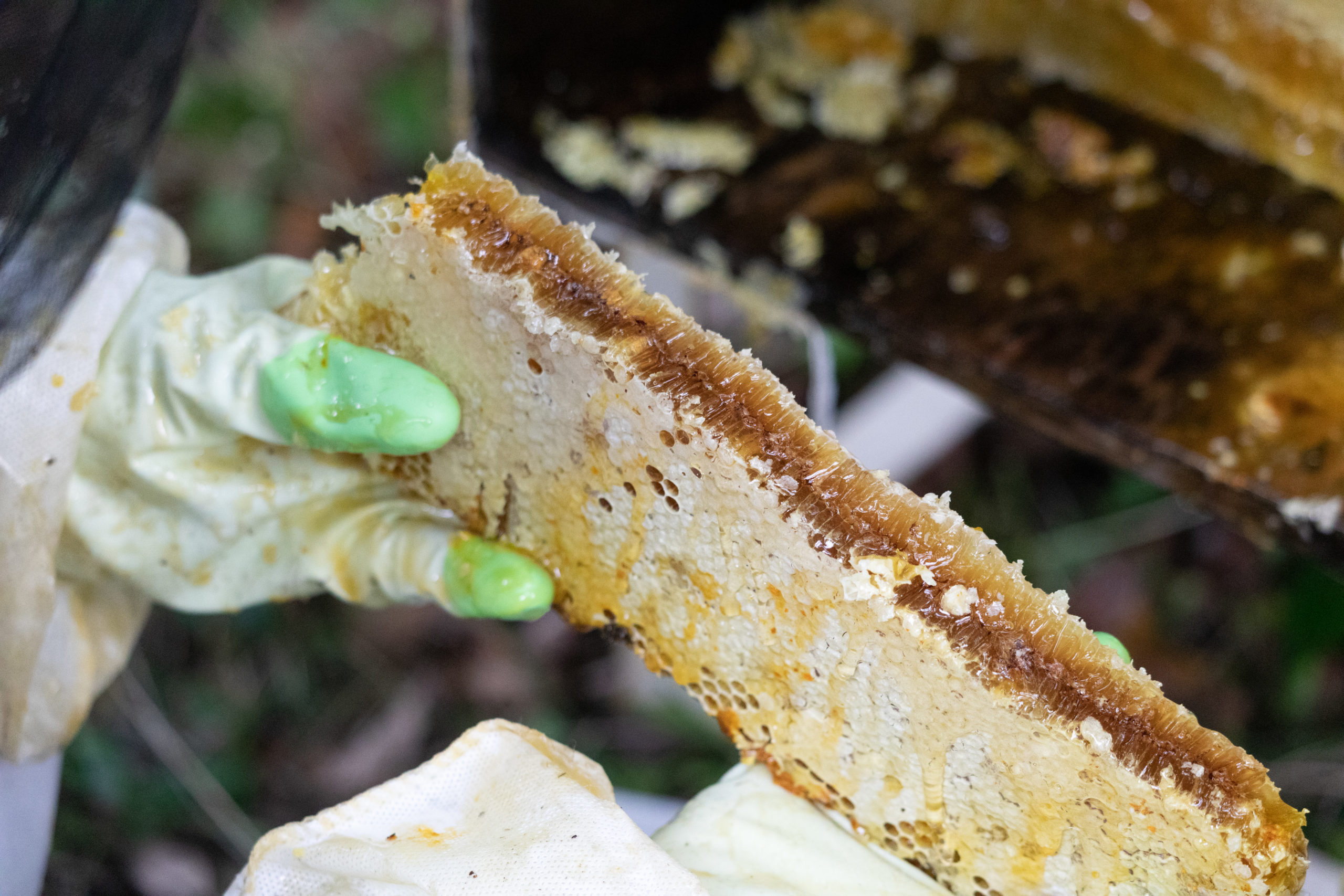 今回使ったニホンミツバチは、野生にいる日本の在来種。蜜は刺激がなく、サラサラしてるのに、味が濃いです。だから固定ファンがいます。