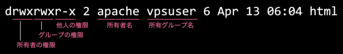 chownはファイルやディレクトリの所有者を変更するコマンドです。apache:vpsuser と指定することで、htmlディレクトリの所有者をapacheに、グループをvpsuserにしています。
