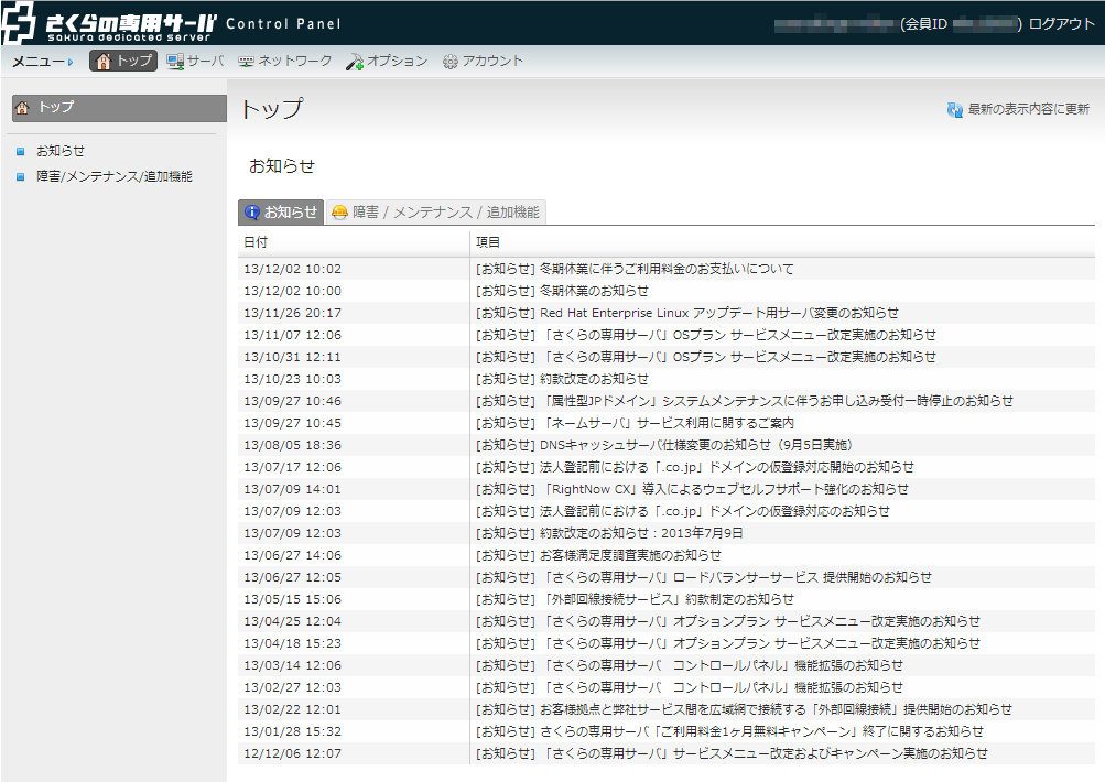コントロールパネルは、Webブラウザで専用サーバの各種操作が行えるものだ(図1)。
