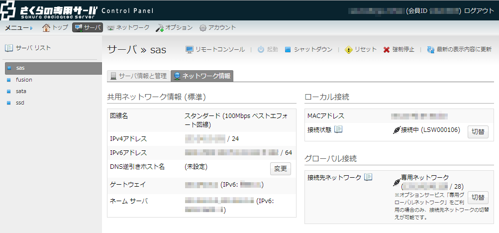 また、さくらの専用サーバでは契約している複数のサーバーをローカルネットワーク内で接続する「ローカル接続」機能や、専用のグローバル接続ネットワークを利用できる「専用グローバルネットワーク」オプションサービスが提供されており、接続するローカルネットワークやグローバルネットワークの切り替え操作もこの画面で実行できる。