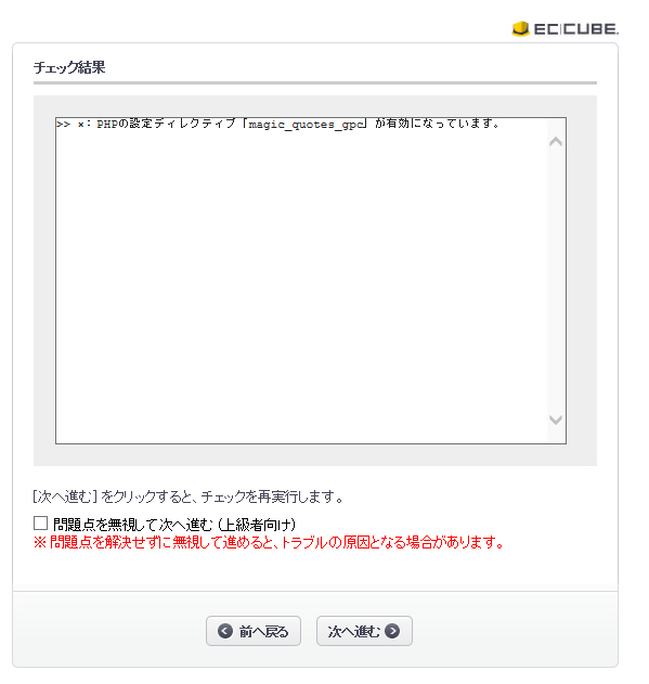 「.htaccess」を削除した後は無事にインストール画面が表示されましたので、案内に沿って進めていきました。するとチェック結果が表示され、「magic_quotes_gpc」が有効になっているという問題点を指摘されてしまいました。