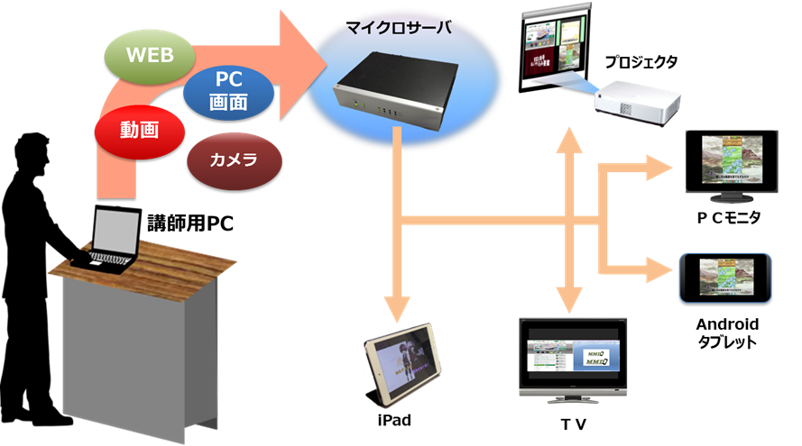 当社では、カメラで撮った映像をクローズドネットワークのサーバを介して、各生徒のタブレット、PCなどの端末にリアルタイム配信できる、安価でシンプルな映像配信のシステムを開発しております。(図1)