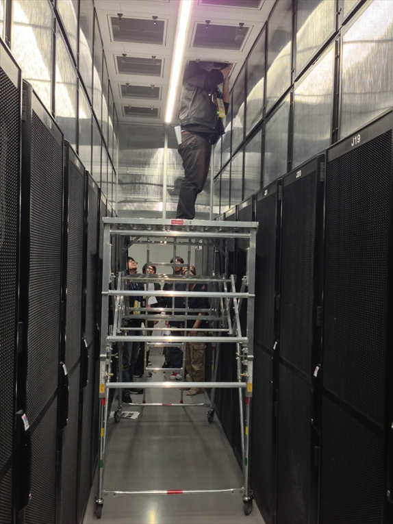 Cゾーンでは、ラック背面通路の天井部分にラックファンを取り付けるため、専用の作業台(高さ1.8m)にシフトスタッフが乗り、設置します。