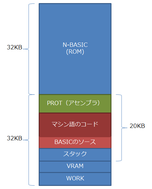PROTというアセンブラは、メモリ上ではN-BASICのソースプログラム領域(だいたい8000Hぐらいから始まります)に配置されていました。PROTは自前のラインエディタを備え、RAMの特定領域にソースを格納し、これをアセンブルして後方のメモリへ出力していました。つまり、PROTを使っているとN-BASICが使えないのです。ただ、N-BASICにもトリックがあって「BASICのソースプログラムの開始アドレス」を指定できるようになっていました。そこでN-BASICのソースの開始位置を、PROTやアセンブルしたマシン語の邪魔にならない位置へずらし、そこでBASICのコードを書いていたのです。たかだか20KBのメモリに、アセンブラ、マシン語のソース、マシン語のコード、BASICのソース、実行のためのワーク領域を詰め込んでいたのですから大変です。ちょっと間違えるとプログラムを壊してしまうのですが、プログラムの保存にはカセットテープしかないので時間もかかるし、壊さないように注意しながらコードを書くしかなかったのでした。