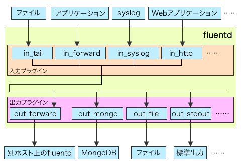 inputプラグインについてはsyslog互換プロトコルやMessagePackベースの独自プロトコル、HTTPのPOSTリクエスト、Unix Domain Socketなどを使うものや、任意のテキストファイルを監視してそこにテキストが書き込まれたらそれをイベントとして受け取る、といったものなどが用意されている。outputプラグインについては標準出力への出力やテキストファイルへの書き出し、MongoDBへの書き込み、任意のコマンドを実行してそこにログデータを渡す、といったものが用意されている。