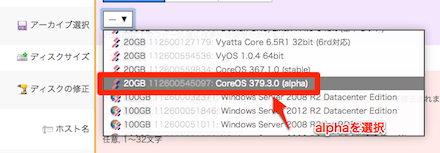 管理画面に入りましたら、サーバの追加を選択します。追加画面では、サーバの名前、メモリ数、ディスクプランなどを決めていきます。大事なのはアーカイブ選択の中にある CoreOS 379.3.0 (alpha) を選択することです(バージョン番号は2014年08月現在です)。これだけで必要なものが揃います。