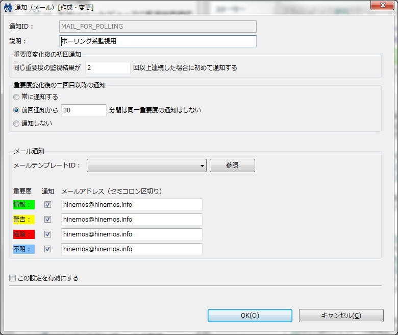 CPU使用率(ユーザ) リソース監視を行うには、「監視設定」パースペクティブを開き、「監視設定[一覧]」ビューのツールバー内にある「+」(作成)ボタンをクリックして監視設定を作成する(図2)。 監視種別を選択する画面が表示されるので、ここでは「リソース監視(数値)」を選択する(図3)。 「リソース[作成・変更]」画面が表示されるので、ほかの監視設定と同様、「監視項目ID」や「スコープ」、取得間隔などを入力していく(図4)。 監視するリソースの種類は、「監視項目」リストボックスで選択する。ここではCPU使用率やディスクI/O、メモリ使用率などが選択できる(図5)。 あとは通知関連の設定を行い、また「収集」にチェックを入れて「OK」をクリックすれば良い。 収集した情報については、「性能」パースペクティブで閲覧できる。「性能[一覧]」ビューに監視項目一覧が表示されるので、確認したい監視項目を選択してツールバーの「グラフ追加」(折れ線グラフのアイコン)をクリックすると画面下側にグラフが表示される(図6)。 HinemosではpingやHTTP、SQL、SNMPなど、さまざまな監視機能を備えている。そして、これらの監視結果がある一定値を超えた場合にユーザーに対して通知を行う機能も備えられている。これにより、なんらかの異常が発生した場合に管理者がより迅速にそれを知ることが可能になる。以下では、このような通知機能を利用する設定に設定について解説していこう。Hinemosでは通知を発生させる条件や通知方法を「通知」という単位で管理している。用意されている通知方法は「ステータス通知」や「メール通知」など6種類だ(表1)。 Hinemosでは通知設定と監視設定が独立したものとなっており、まず通知設定で通知の表示方法などを指定し、続いて監視設定で使用する通知設定を指定する、という流れとなる。 今回はステータス通知およびイベント通知、メール通知について説明しよう。まずステータス通知およびイベント通知だが、これらは通知発生時に「監視」パースペクティブ内の「監視[ステータス]」および「監視[イベント]」ビューにその旨を表示させるというものだ。たとえば図7は、ping監視の結果がある一定値を超えた場合に「情報」もしくは「危険」という通知を発生させ、「情報」という通知についてはステータス通知で、「危険」という通知についてはステータス通知およびイベント通知で出力された例となる。 ステータス通知とイベント通知の違いだが、ステータス通知についてはそれぞれの監視項目ごとに最新の結果しか表示されず、同じ監視項目からより新しい通知が発生した場合表示が上書きされるのに対し、イベント通知は明示的に削除しない限りリストに表示され続ける。ステータス通知は監視対象の最新状況を把握するためのもので、イベント通知は監視対象で発生した問題をログとして記録するためのものと考えれば良いだろう。 Hinemosではデフォルトでいくつかの通知設定があらかじめ用意されており、これらは監視設定パースペクティブの「監視設定[通知]」ビューで確認できる。既存の通知を編集するには、編集したい通知を選択してツールバーの「編集」をクリックする(図8)。 たとえば通知ID「EVENT_FOR_POLLING」は、ping監視などのポーリング型監視向けの通知設定だ(図9)。 ここでは、監視項目ごとに通知を発生させる条件を指定できる。たとえば「EVENT_FOR_POLLING」通知設定のデフォルトではすべての重要度のイベントについて、監視結果の重要度が変化後2回以上同じ重要度となった場合に通知を行うように設定されている。 監視結果に応じた通知を行うには、通知ごとの設定を行った後、監視項目ごとの設定画面で「監視」を有効にし、さらにその通知IDを登録しておく必要がある(図10)。 監視項目ごとの設定画面を開き、「通知」枠内の「選択」をクリックすると、通知一覧が表示される(図11)。ここで使用したい通知にチェックを入れ、「OK」をクリックする。 たとえば図11のように指定した場合、指定した監視結果の重要度に応じて「EVENT_FOR_POLLING」通知と「MAIL_FOR_POLLING」通知、「STATUS_FOR_POLLING」通知が行われる。 メール通知の場合も、基本的な設定方法はイベント通知やステータス通知と同じだ。たとえばpingの値が一定以上となった場合にメールで通知を送るという設定を行いたい場合、デフォルトで用意されているメール通知設定(通知ID「MAIL_FOR_POLLING」)をカスタマイズして使用すれば良い(図12)。 メール通知設定についても、設定項目はイベント通知やステータス通知とほぼ同じだ。メール通知で異なるのは、重要度ごとに通知メールを送信するメールアドレスを設定できる点だ。また、デフォルト設定ではリスト2のようなメールが送信される設定となっている。 リスト2 通知メールの例