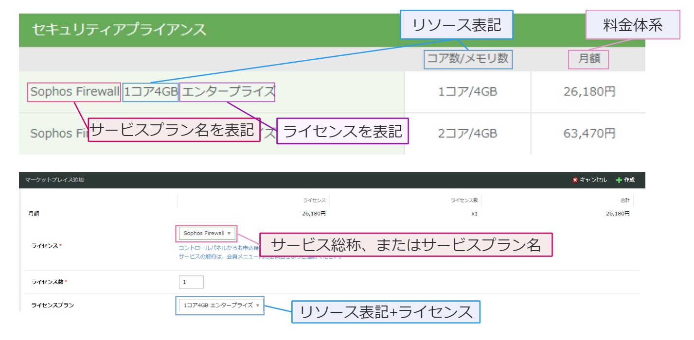 ライセンス 単一、または複数機能に提供ライセンスが異なり種類が存在する際は、 ライセンス名 を定義、サービスプランの末尾に付与します。