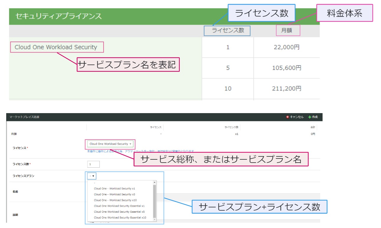 ライセンスの提供条件、利用に上限などが伴うものは、サービスプランの名称に表記するものがあります。