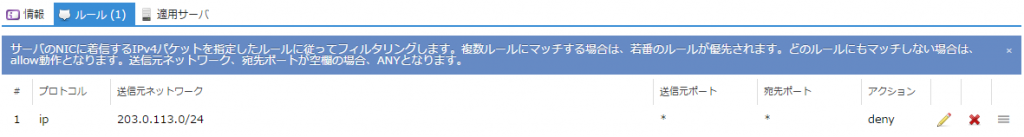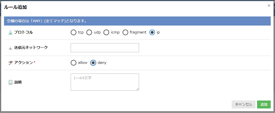 いずれの条件にもマッチしなかったパケットを全て拒否する場合は、以下のように「送信元ネットワーク」を空欄、「アクション」で「Deny」を選択したルールをルールリスト末尾に追加します。