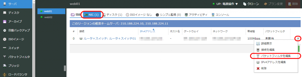 パケットフィルタを適用したいサーバの詳細画面を開き、「NIC」タブをクリックします。サーバに取り付けられている仮想NICのリスト画面が表示されるので、パケットフィルタを適用したいNICの右側の「▼」アイコンをクリックし、表示されたポップアップメニューより「パケットフィルタを編集」をクリックします。