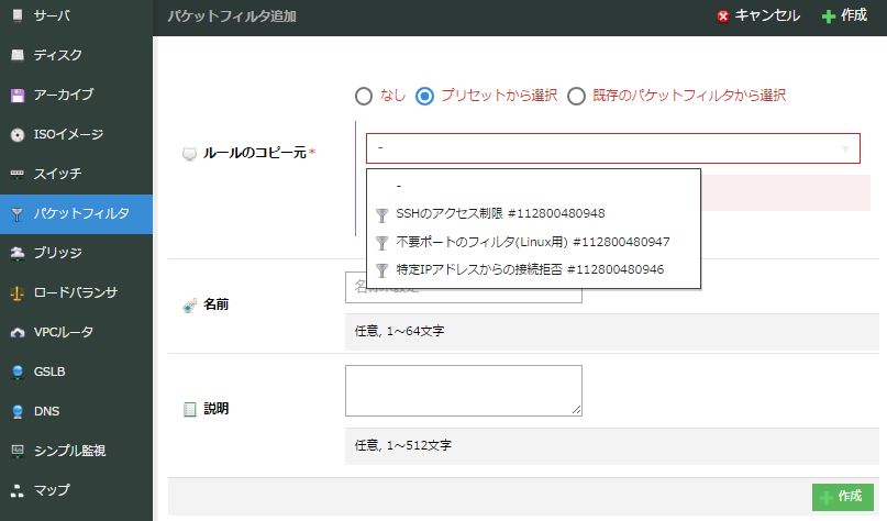 任意でパケットフィルタの名前と説明を記入し、右下の「作成」ボタンをクリックします。すでに作成済みのパケットフィルタがある場合、「パケットフィルタ選択」ポップアップメニューで選択することにより、同じフィルタ設定のものを作成することができます。