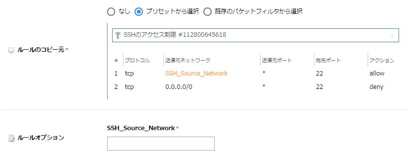 インターネット上で主に用いられるポート以外の接続を拒否するためのフィルタです。SSH_Source_NetworkとNTP_Source_Networkに入力することで対象IPアドレス(CIDR表記対応)に限定することができます。