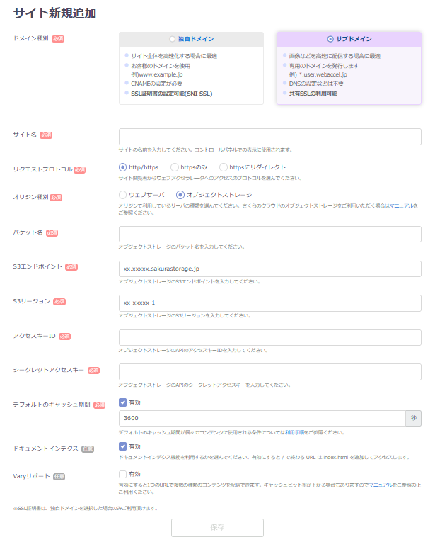 このページではオブジェクトストレージのキャッシュ配信に ******.user.webaccel.jp のサブドメインを利用する場合の設定方法を解説しています。