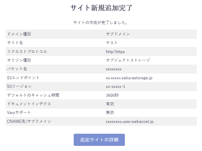 - ご利用手順 をご参照の上オブジェクトストレージでサイト、バケットの作成、コンテンツのアップロードとパーミッション設定によるアクセスキーの発行を行ってください。