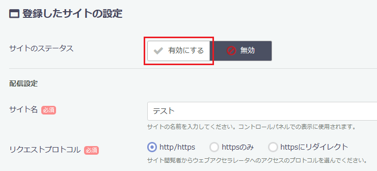 | リクエストプロトコル | ウェブアクセラレータへのアクセスのリクエストプロトコルを指定します。 http/https:httpとhttpsのどちらのアクセスも許可します。 httpsのみ:httpsのアクセスのみを許可し、httpのアクセスは拒否されます(404 Not Foundになります)。 httpsにリダイレクト:httpのアクセスはhttpsにリダイレクトします。httpsのアクセスはそのまま許可します。 |