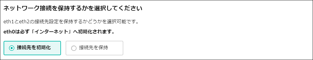 ここまでの手順ではインストール操作時に「接続先を初期化」していましたが、「ネットワーク接続の設定」で「接続先を保持」を選択します。実際の操作は 「パブリックISOインストールからの起動を実施する」の「5. ネットワーク接続の設定を行う」をご参照ください。