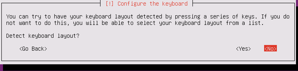 キーボードの選択は次の画面で手動設定が可能なため、Detect keyboad layoutはそのまま「No」を選択してください。