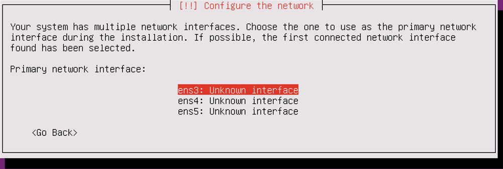 ネットワークの設定を「ens3」に対して行います。選択するとDHCPでのIPアドレスの取得が開始されますので、「Cancel」を選択しても構いません。