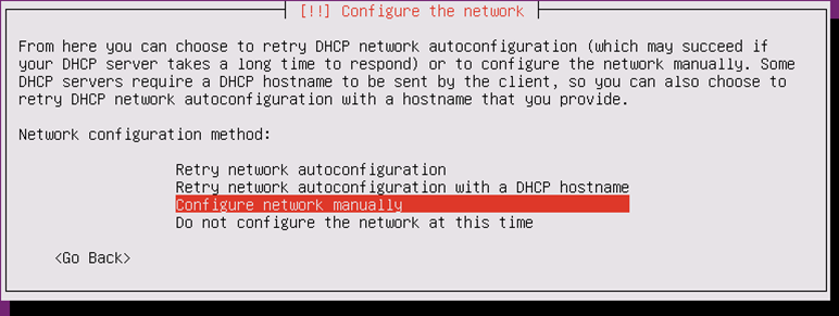 「Configure network manually」を選択して手動でIPアドレスの設定を行っていきます。
