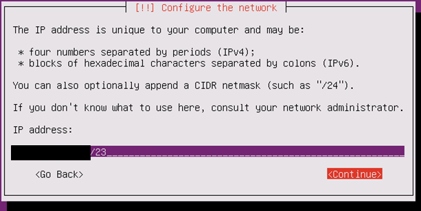 ホスト名が名前解決されていない場合、外部との疎通に失敗している可能性もあります。一度「Go Back」で戻り、再度「Continue」を選択して状況が改善されない場合、帯域制限がされていないか等、ご確認ください。