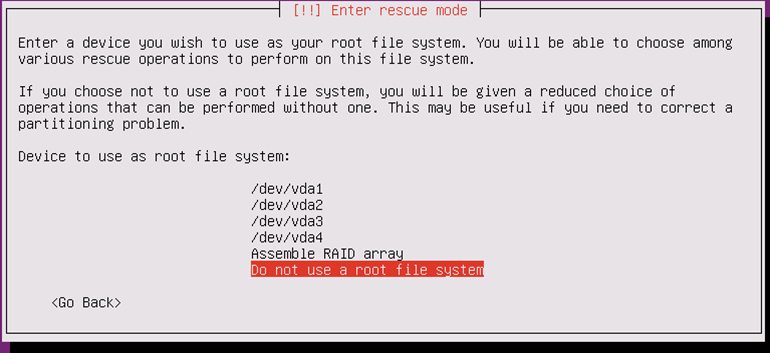 ただしパーティションが正常に読み込めない場合は失敗する可能性があるため、「Do not use a root file system」を選択してもらうのが早いと思われます。