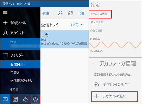 6. 画面左下の歯車マークのアイコンをクリックし、「アカウントの管理」をクリックします。次に作成したアカウントをクリックします。