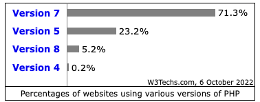 下記はWebサイトでのPHPの使用統計ですが、2022年10月6日時点のデータでPHP5系が23.2%を占めているのです。ちなみにさくらのレンタルサーバの利用統計もこちらに近い数値になっています。