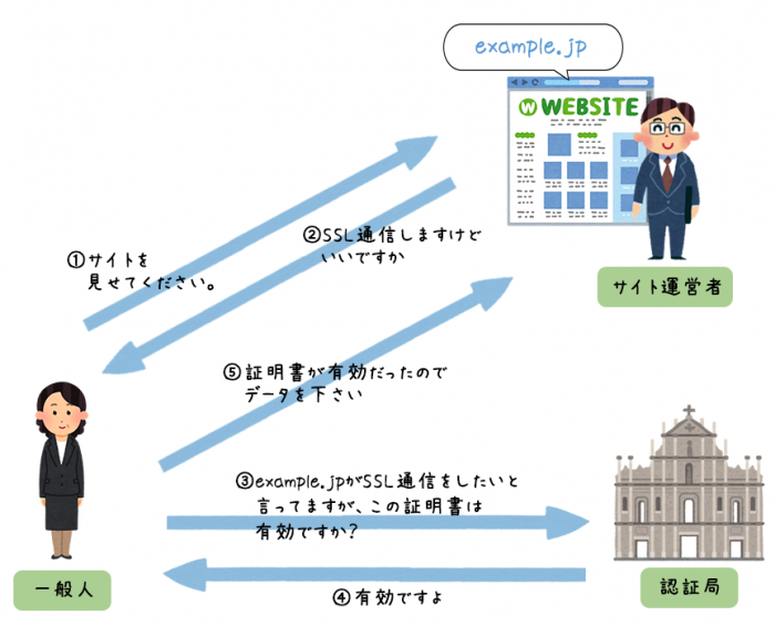 認証局は証明書が欲しい申請者の申請を受け付けて、その申請者がドメインを持っているかどうかを確認して、証明書を発行してくれます。これにより、自分がアクセスしているサイトはexample.jpだと保証された状態でサイト閲覧ができ、なりすましや改ざんを防ぐことができるわけです。
