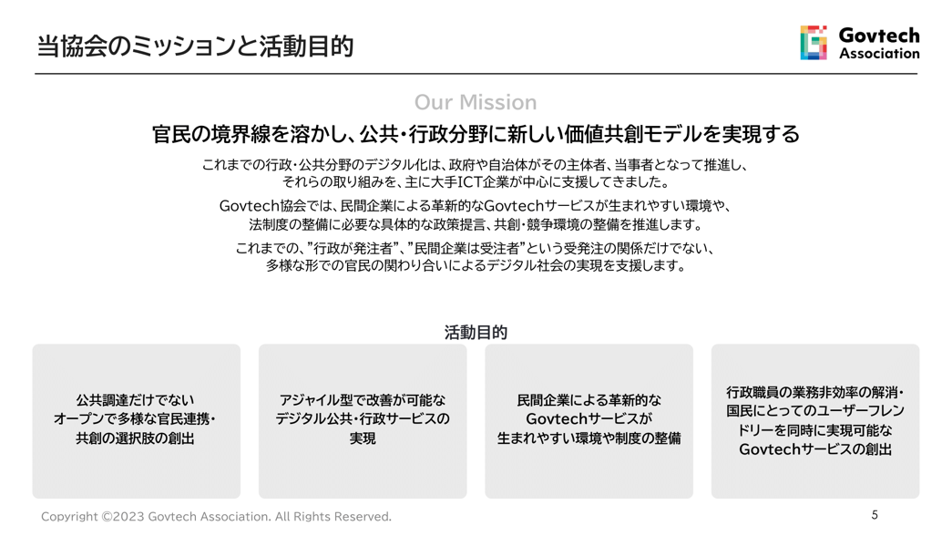 Govtech協会は、2023年4月の終わりに日本でおこなわれたG7群馬高崎デジタル・技術大臣会合を皮切りに本格的に動き出した。「公共行政分野の社会課題をテクノロジーで解決したい」──そんな志を持つ会員企業が、デジタル庁の横にブースを構えて活動している。Govtech協会設立の狙いは、どこにあるのだろうか。