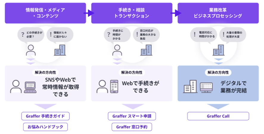 Graffer Platformには、「Graffer 手続きガイド」「お悩みハンドブック」「Graffer スマート申請」「Graffer 窓口予約」「Graffer Call」という5つのプロダクトとサービスがある。
