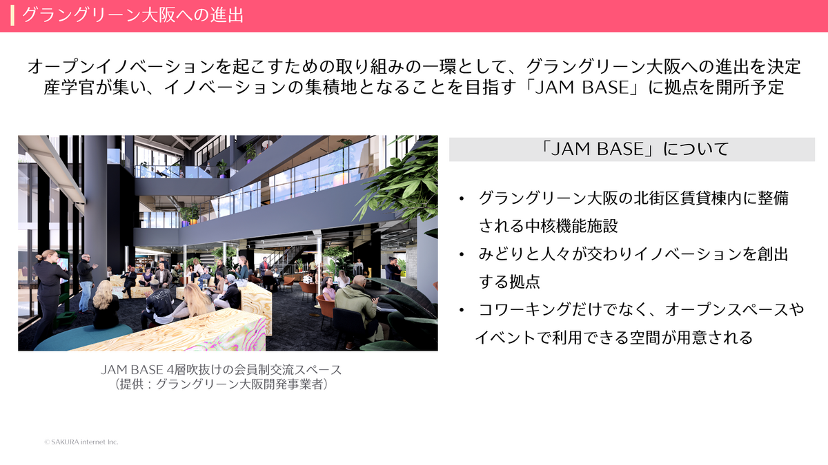 「グラングリーン大阪」は、北街区賃貸棟内に整備される中核機能施設「JAM BASE(ジャム ベース)」を中心に、新たなオープンイノベーションを推進する施設として期待されています。多くの人々が交われるよう、あえてさまざまな用途・機能を共存させ、一体感(つながり)のある施設配置や空間構成としていることが特徴だそうです。これこそがさくらインターネットが目指している世界観そのものだなと思い進出を決めました。