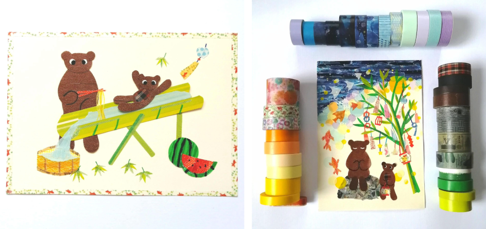 マスキングテープを使ったちぎり絵や貼り絵を制作しています。オリジナルのクマのキャラがいて、そのクマがいろんなところに遊びに行く場面をマスキングテープで描いているんです。集中したら3~4時間は作業していますね。