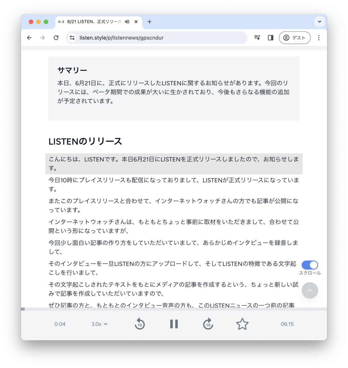 誰でも簡単に、ブログよりもカジュアルにポッドキャストを始められる。それは、はてなを育てた近藤さんが率いるONDだからこその開発思想だ。実際、「LISTEN」は誰もが無料で自分の音声チャンネルを持つことができて、ブラウザからボタン1つですぐに録音し配信できる。さらに、ただ音だけの発信ではなく、Whisperによって文字起こしされ、サマリーも出力される。「LISTEN」で投稿されるコンテンツの多くはより私的で、日常的なものだ。そのような機能と性質から、同サービスの個人ユーザーの投稿は、自然発生的に「声日記」と呼ばれているという。