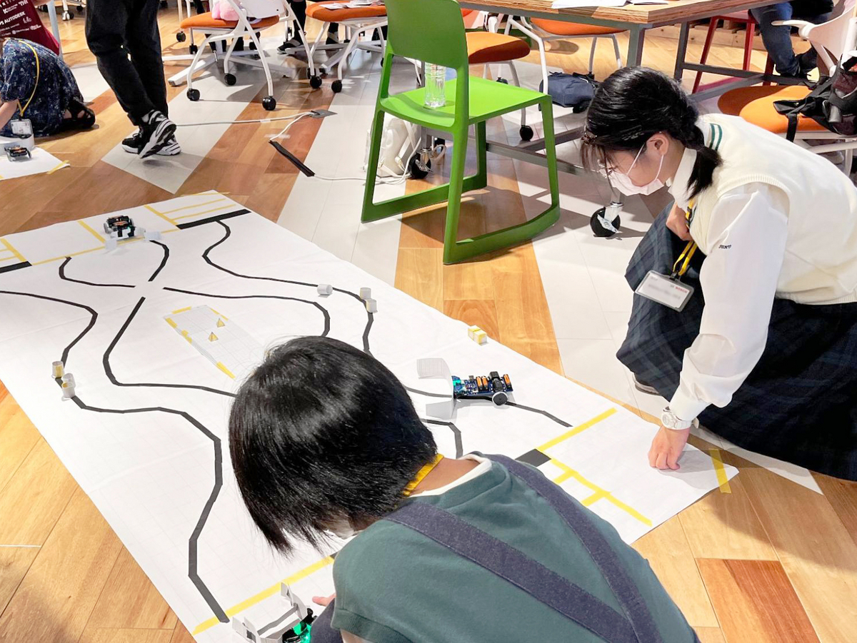 参加者は、トライアンドエラーを繰り返してロボットカーの動かし方を習得していきました。簡単な動作を理解してからは、「ループ」や「論理演算」という少し複雑なコマンドについても学び、机から落ちない車、障害物をよける車、ライントレースする車など、ステップアップしていきながらプログラミングを身に付けていきました。
