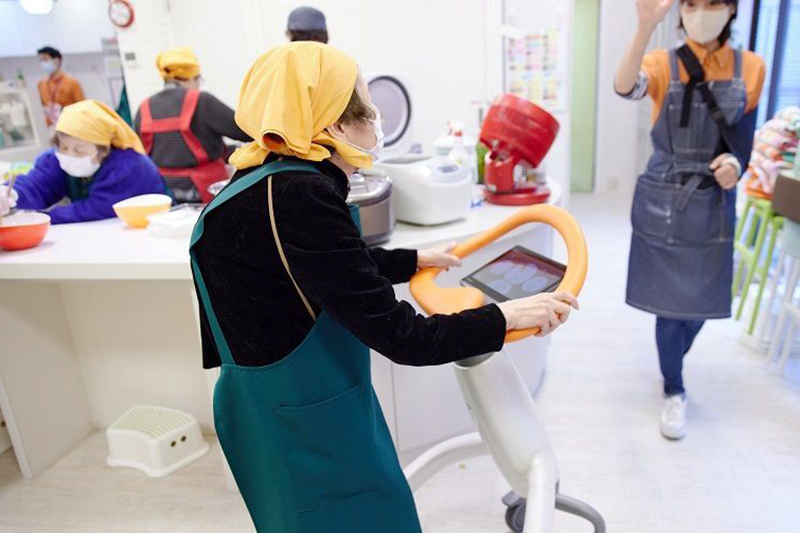 なないろクッキングスタジオ自由が丘では料理療法のほか、パナソニック社の最新の歩行トレーニングロボットによる歩行訓練もおこなっている。スリムでコンパクトな見た目のため場所を取らず、ハンドル部分は、デイサービスのビタミンカラーのインテリアによく馴染む鮮やかなオレンジ色だ。