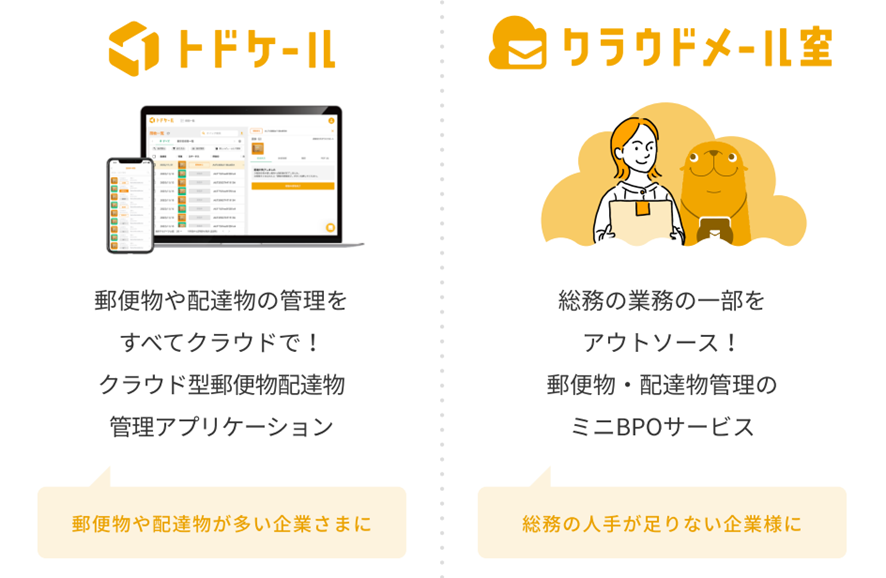 トドケールはそのような総務の郵便物管理にまつわる「不」を解決するために、「トドケール」と「クラウドメール室」という2つのサービスを展開している。