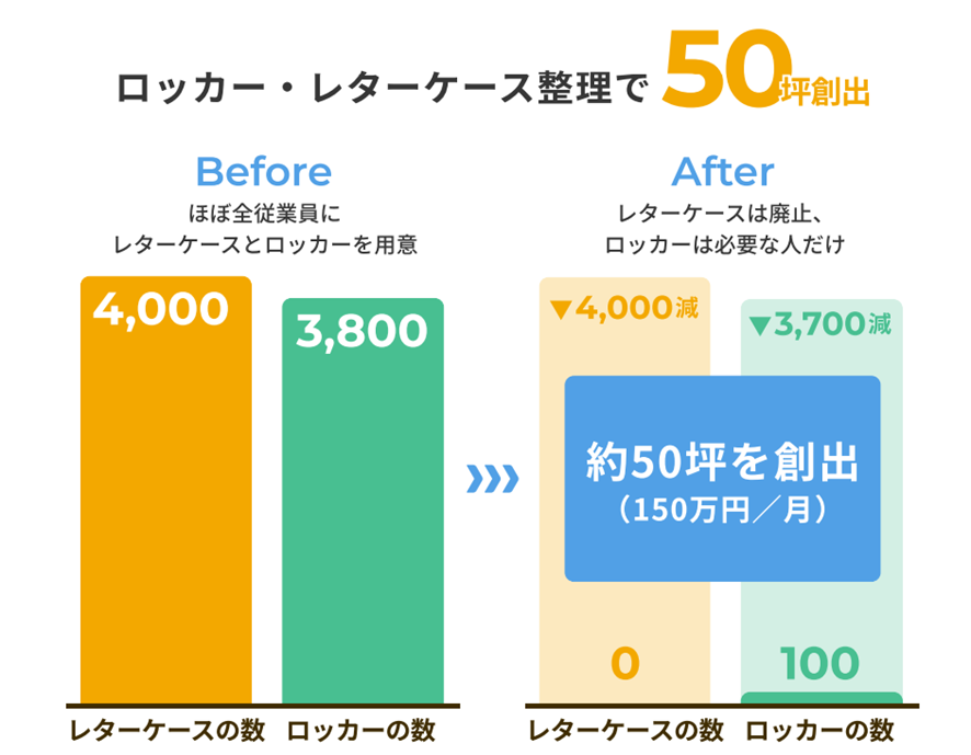「たとえば、ある企業では郵便物を月に2通以上受け取る社員は全体の5~15%ほどに留まり、残りの大多数の社員は月1通以下。さらに、その残りの社員のうち約80%の社員は、年1通しか受け取らないということがわかりました。つまり、多くの社員は郵便物を受け取る機会がほとんどないということです。その企業では全社員にレターケースを用意していましたが、このデータをもとにレターケースを廃止。年1通程度の受け取りの場合は、メール室まで直接取りに来てもらうオペレーションに変更しました。結果、50坪ほどオフィススペースを創出できたそうです」