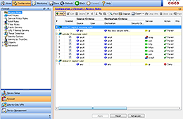 - 直感的なセキュリティポリシーの管理を可能にする、ウィザードと操作性に優れた管理用ウェブインターフェース(右図)をご用意。「CISCO ASA5585-X」の標準U/Iである「Adaptive Security Device Manager(ASDM)」を提供します。