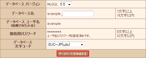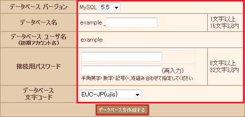 作成するデータベースの情報入力後『 データベースを作成する 』ボタンを押します。