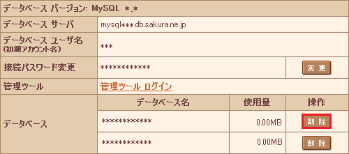 該当データベース名の右側に表示している『 削除 』ボタンを押します。