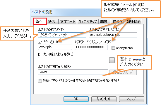 追加ユーザで接続(ログイン)する場合はこちらをご確認ください。 - ※4 FTPアカウント名は、「仮登録完了のお知らせ」あるいは「登録完了のお知らせ」を確認してください。