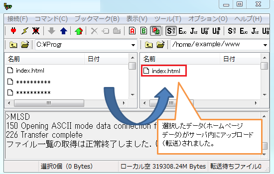 選択したファイルが右側のウィンドウ(サーバ)へ転送されます。