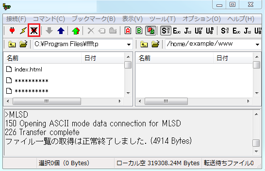 転送を終えたら、切断ボタンか、『 接続(F) 』-『 切断(R)』をクリックし、