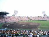 結局3時ごろに球場へ行ったものの、銀傘の下はもういっぱい。まあ、第三試合のころには涼しくなっているだろうと、炎天下の席を確保しました。ただ、ちょうど全体を見渡せる場所で、且つそれほどグランドからも遠くなく、通路も近くビール(高い!)を買うにも困らない、いい席でした。